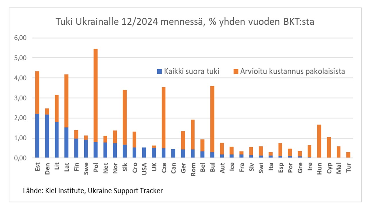 Olennainen piirre Ukrainan tukemisessa on, että suhteessa talouden kokoon taakkaa ovat kantaneet ylivoimaisesti eniten Itä-Euroopan verraten köyhät maat, etenkin jos otetaan huomioon pakolaisista aiheutuneet kustannukset, ja näiden jälkeen Pohjoismaat. Isoista Euroopan maista suhteellisestikin eniten tukea on eri muodoissa antanut Saksa.