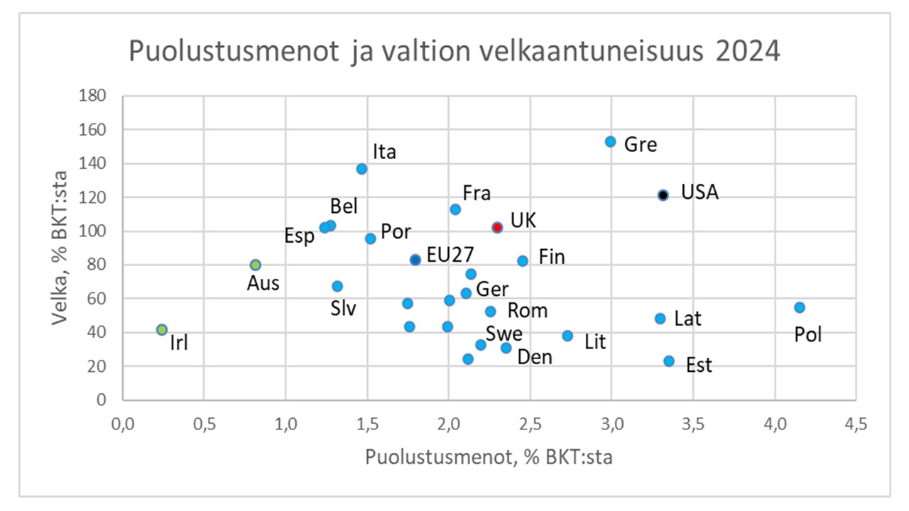 Huomionarvoista on, että vähän puolustusmenoihin käyttäneet maat ovat myös olleet usein kitsaita Ukrainan tukemisessa. Tämä viittaa siihen, että Venäjän aiheuttamaa turvallisuusuhkaa ei ole koettu suureksi. Mutta myös julkisen talouden ahtaus on epäilemättä ollut myötävaikuttanut tekijä.